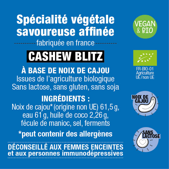 Noix de cajou* (origine Vietnam) 61,5g, eau 61g, huile de coco 2,26g, fécule de manioc, sel, ferments